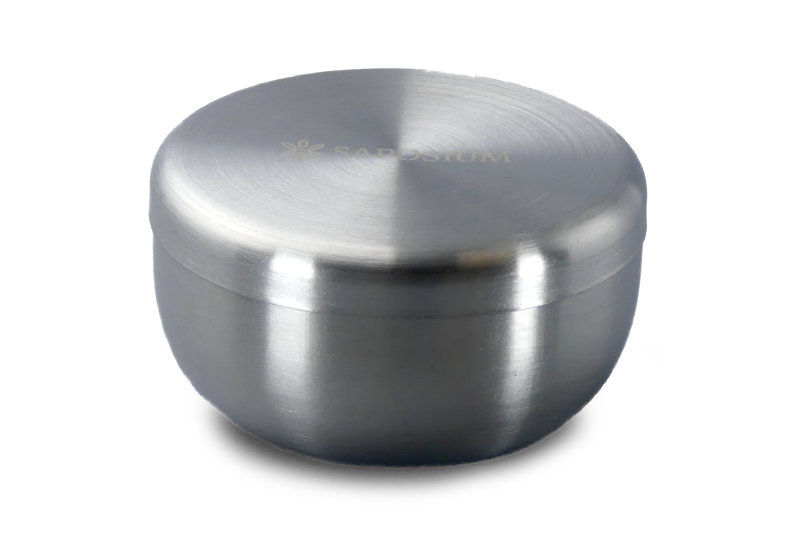 Diese Schale aus mattem Edelstahl hat einen Deckel, damit die Rasierseife nach Gebrauch auch staubfrei aufbewahrt werden kann. Für die Reise würde ein Gummiband ausreichen und Mann hat seine Rasierseife auch immer dabei.